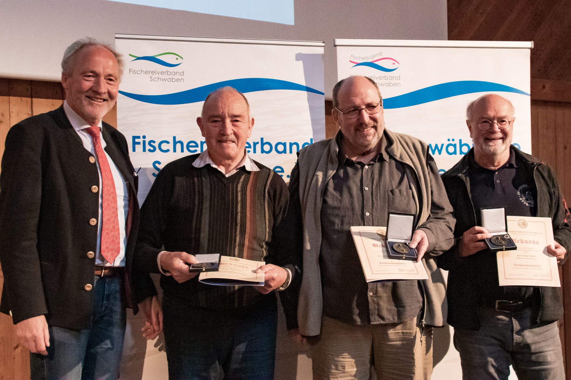 Vor den Vorträgen standen noch Ehrungen für besonders engagierte Mitglieder an, die sich über lange Jahre für die Fischerei verdient gemacht haben, die aber darüber hinaus noch eine andere Leidenschaft mit Bächen und Flüssen verbindet. Diese drei Persönlichkeiten sind die besten Beispiele für unser Motto „Fischen ist mehr als Fische fangen“, so Weirather. Beppo Haller aus Ottobeuren, Friedrich Mattauch aus Dillingen und Albert Kapfer aus Rain am Lech erhielten mit der Verdienstmedaille die höchste Auszeichnung, die der Fischereiverband Schwaben, außer der Ehrenmitgliedschaft, zu vergeben hat.