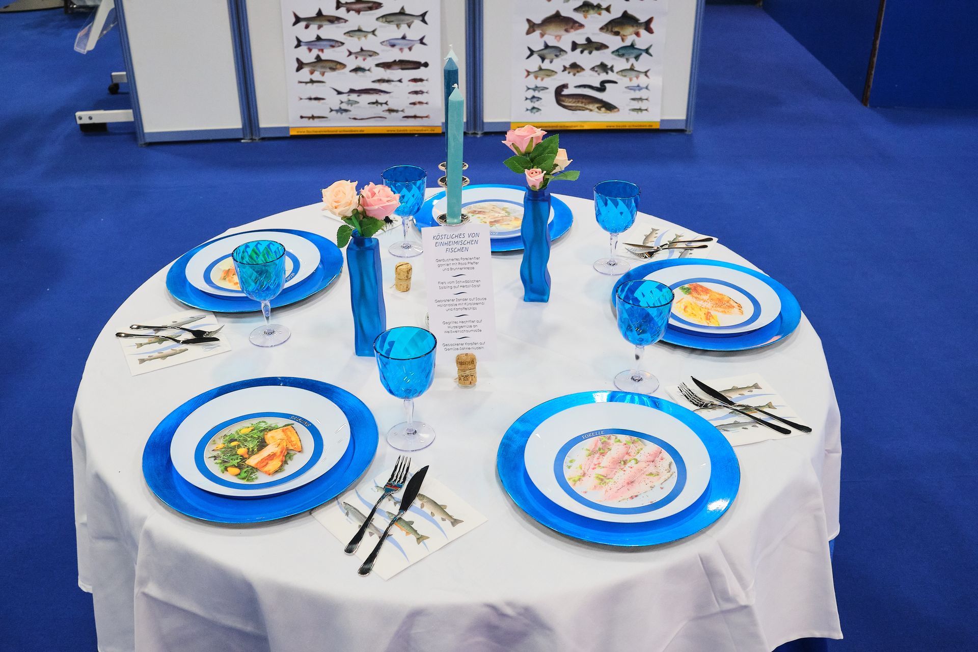 Heimischer Fisch ist aufgrund seiner Inhaltsstoffe und deren Zusammensetzung eines der wertvollsten Lebensmittel. Um die Wertigkeit der heimischen Fische für die Besucher darzustellen, wurden diese an einen festlich gedeckten Tisch geladen. Auf den Tellern lagen leider keine knusprig gebratenen Karpfen, sondern Bilder von verschiedenen Gerichten, die man leicht zubereiten kann. In einem weiteren Modul wurden die Nährwerte von Fischen im Vergleich zu anderen Lebensmitteln dargestellt.