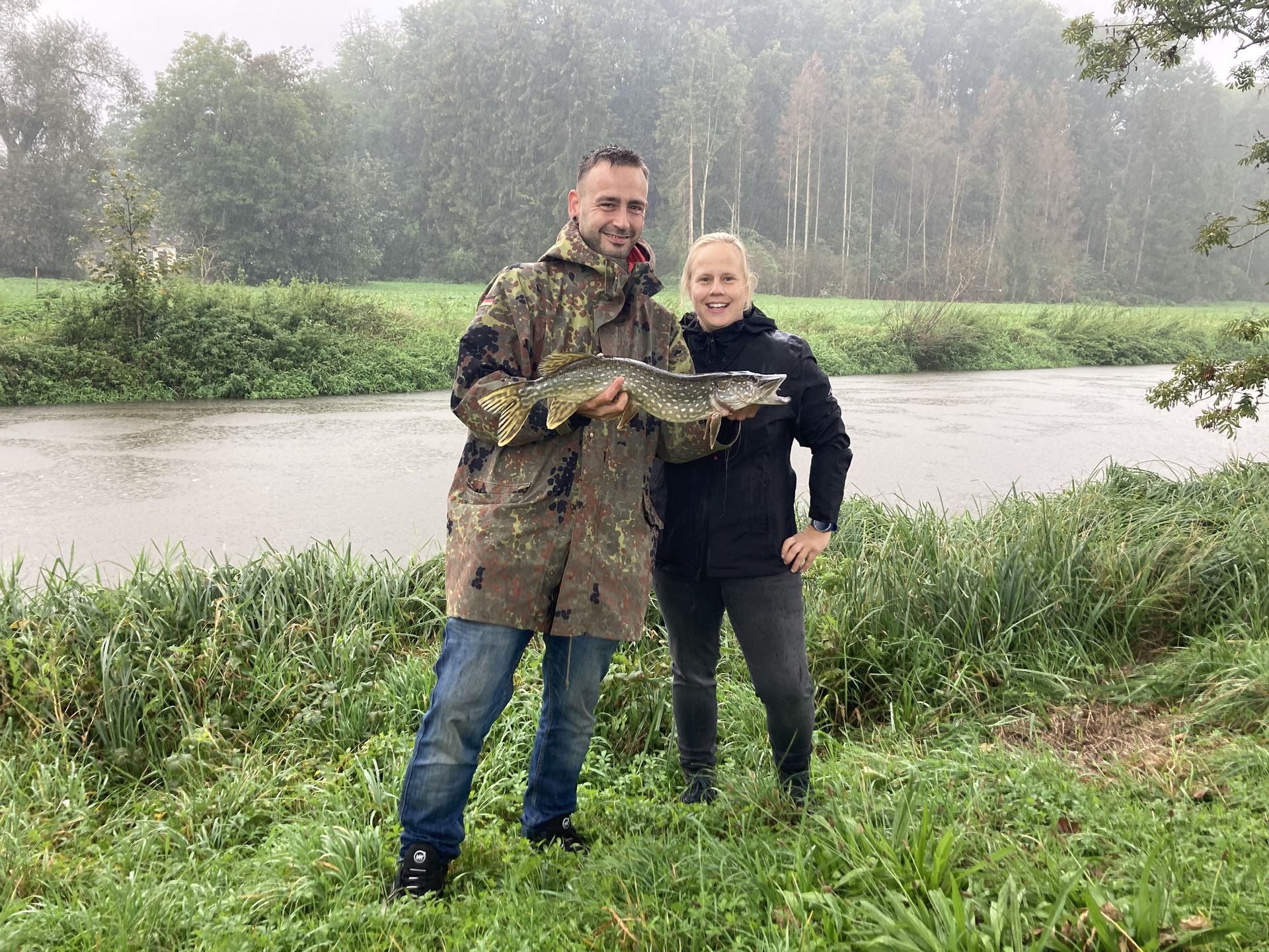 Nachdem die Experten des SFV Ortlfingen den Streckenabschnitt an der Schmutter für das gemeinsame Fischen erklärt und hilfreiche Tipps gegeben haben, ging es direkt raus an das sehr interessante und abwechslungsreiche Fließgewässer. Das Wetter war zunächst bewölkt und im weiteren Verlauf regnerisch und es wurden von Anfang an sehr viele Fischaktivitäten bei trübem Wasser und erhöhtem Pegel beobachtet. Und so kam es, dass relativ schnell die ersten Fische gekeschert werden konnten.