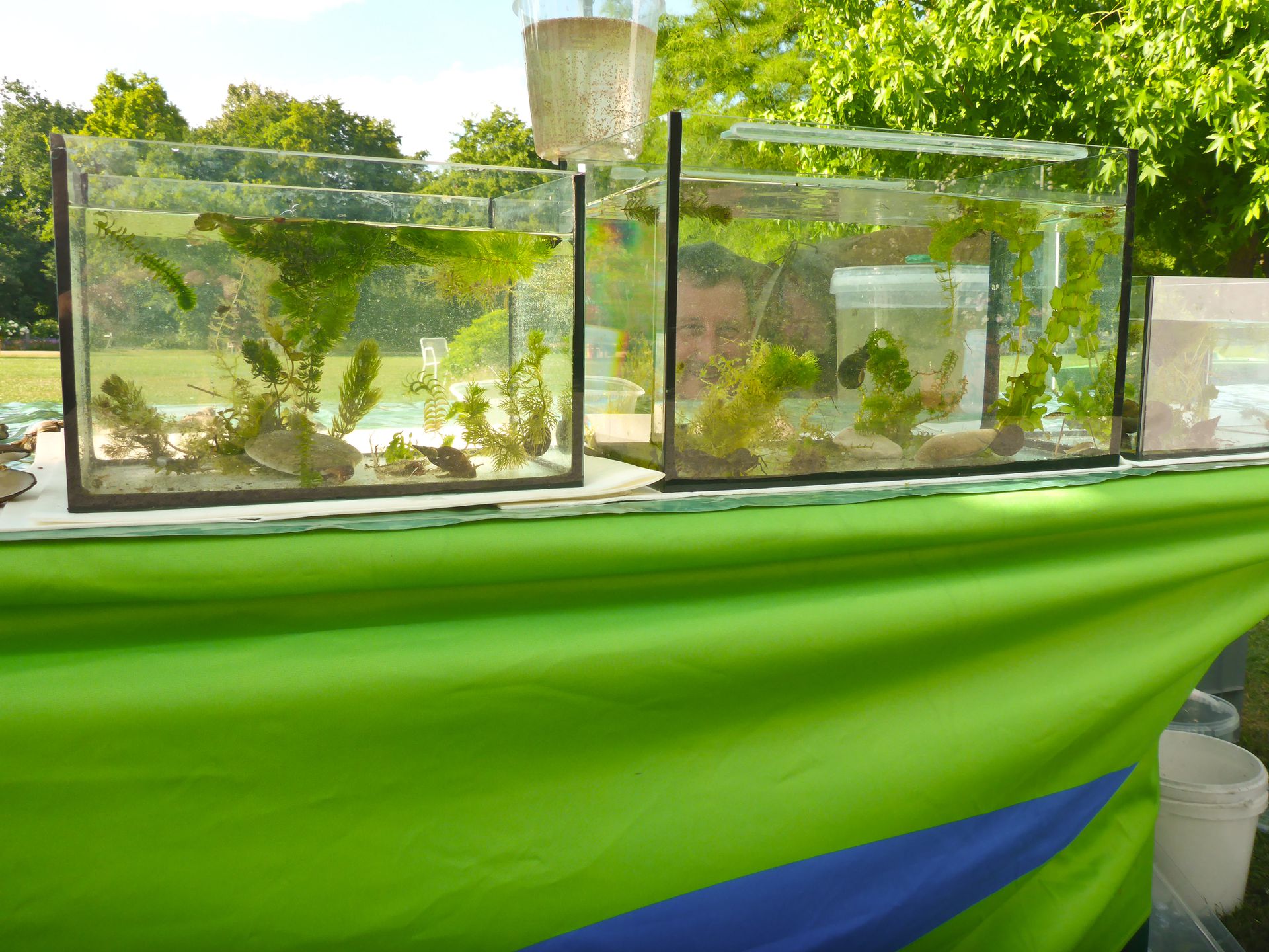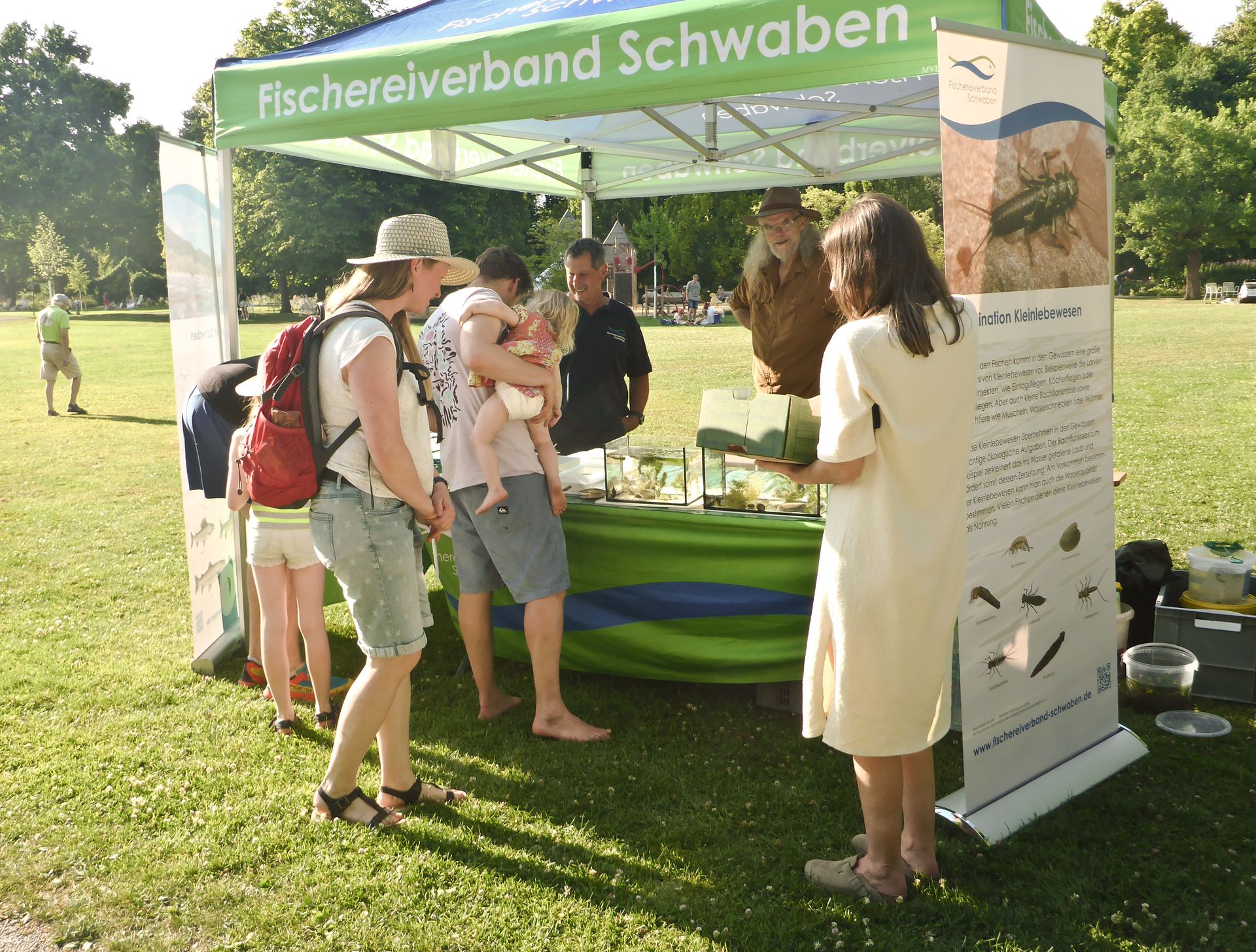 Ab 18:00 Uhr kamen bei schönsten Wetter zahlreiche Besucher, vor allem Familien mit Kindern und bestaunten mit Begeisterung aus nächster Nähe Fische, Wasserpflanzen, Fischnährtiere, Schnecken und Krebse in Aquarien und Becherlupen.